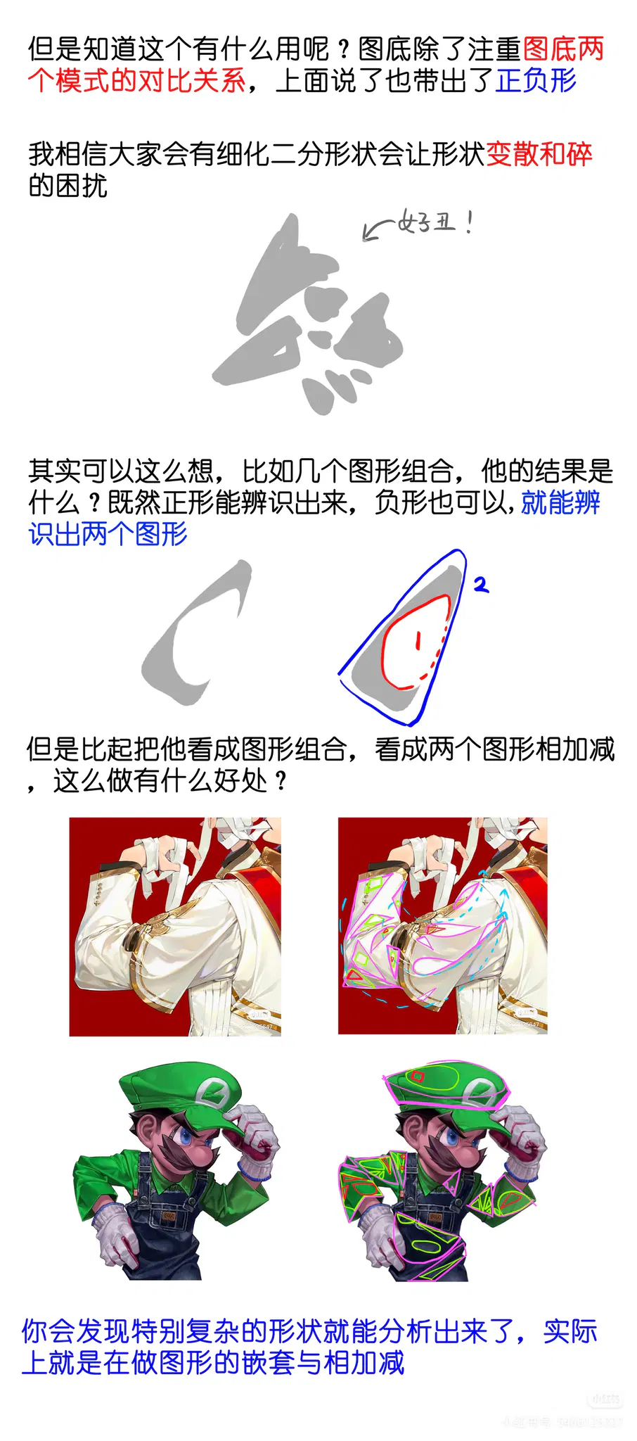 这个教程系列很有用!这里提到把图形构成的知识融入到二分阴影里,之前我都没意识到二分也是一种图形(负形)之间的穿插排布,,得理解原理,不然二分细化下去局部不错却没有整体感 ​:blobcatthinking: