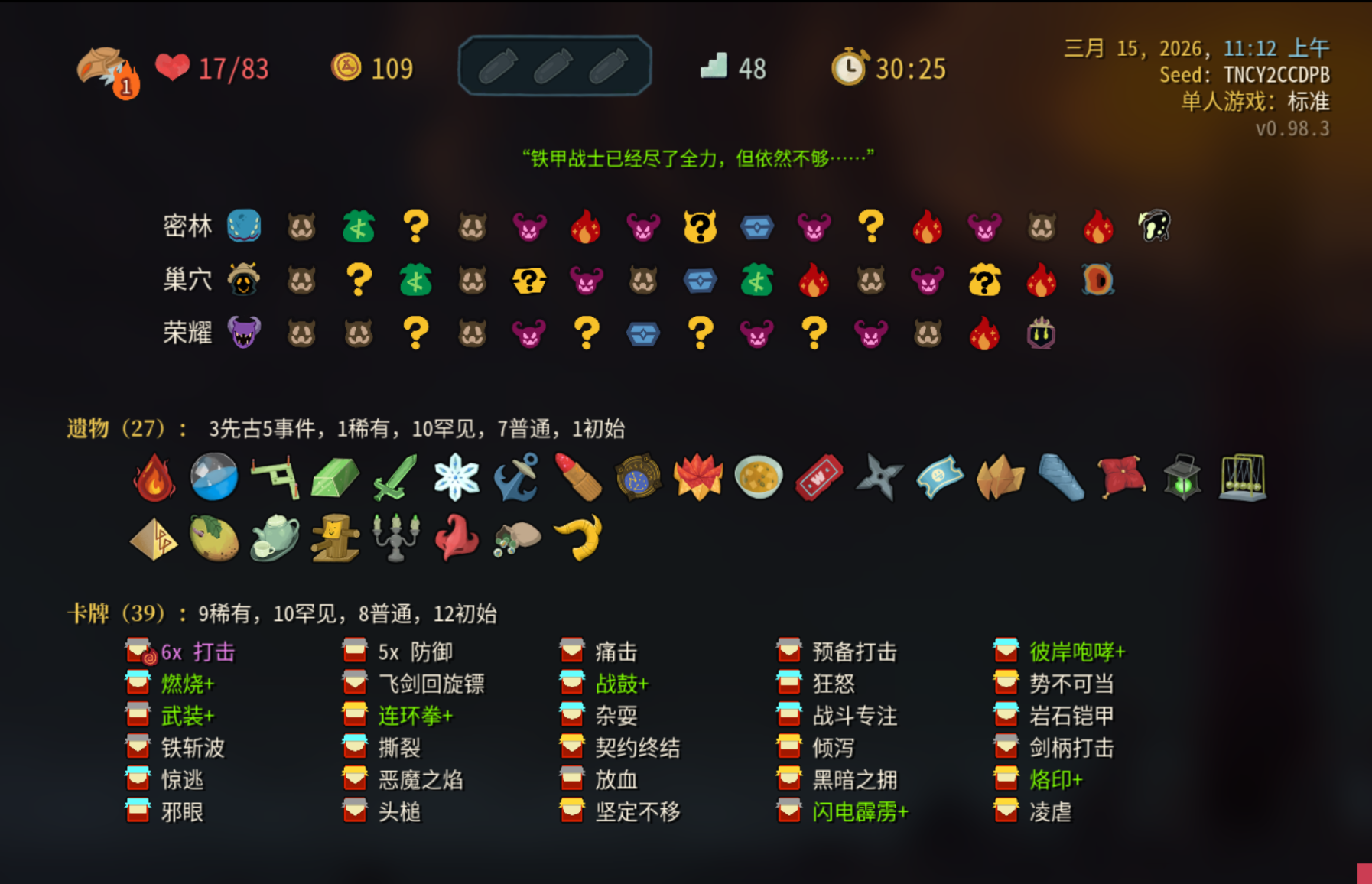 拼尽全力来到boss前 输在了防御端抓少了而且没法过牌(遗物