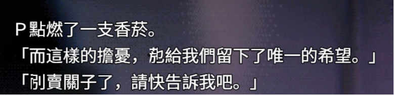 重新想了一下感觉有些神秘的地方,可能因为结合了现实的原因吧……P说要在游戏里加乱七八糟的bug,听起来是一种想要以糟蹋作品的方式逼D现身的态度,但是实际游戏的重点其实是以这个游戏为外壳,诱导玩家帮忙去找到D的表现……BUG中藏有的文本(哪怕是对P相当不利的内容)应该都是P完全知情的情况下加入游戏的,这一点有点没想通……虽然确实噱头是在说揭露游戏业界的黑暗,但是P就是这里面最坏的人了,他甚至不干涉内容掩盖一点自己的问题……?但是游戏本体的内容确实是让玩家认为D还活着并且伤害了这两个人,并且28年后失踪的这个人是D…………