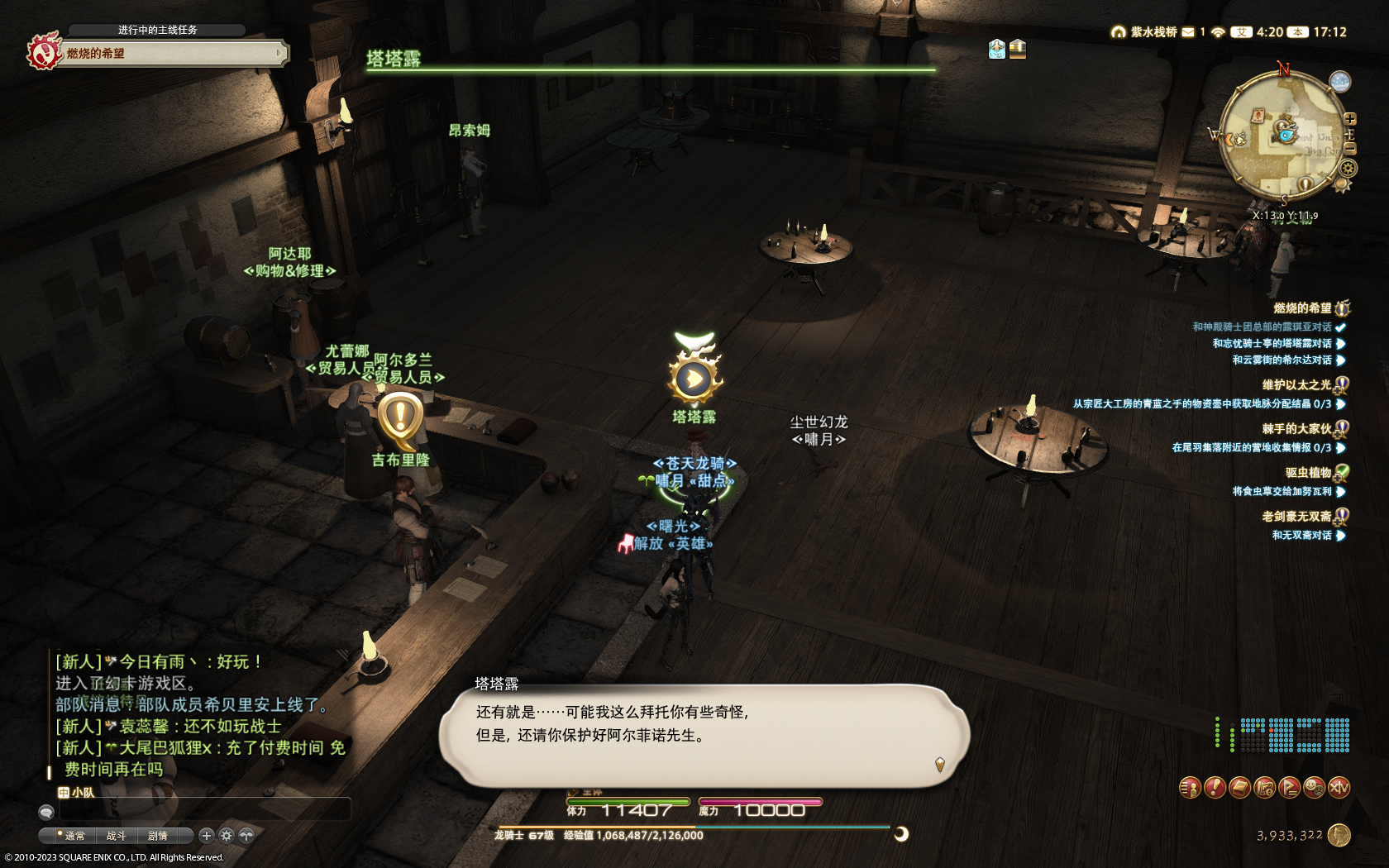 呃,塔塔露你别说这话我有点害怕……不如说阿尔菲诺让主角跟大家打招呼就有点令人害怕……感觉好像3.0决战之后主角会被什么神秘力量甩失忆甩到北美洲大陆在当地土著的帮助下重新开始模拟人生一样……