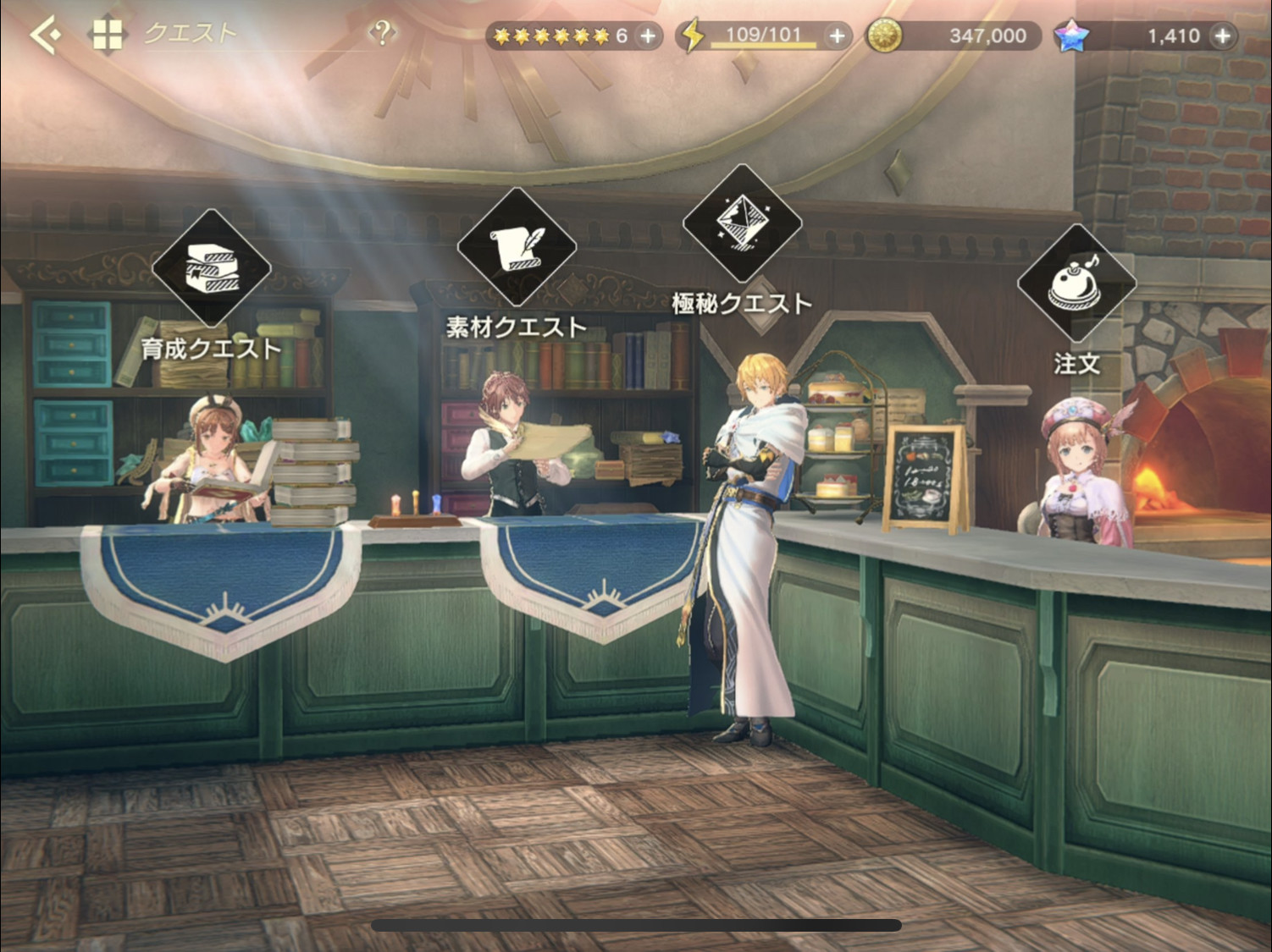 任务分育成和素材,育成根据主要获得物的不同可分为经验、雫(メモリア升级素材)、克尔(金币)、光玉、角色突破用碎片(每天只能打一次)。素材包括和主线里的战斗一样的刷分任务,还有一个和以前外出探索一样的,在该区域发光的位置采集素材并击败路上遇到的魔物。