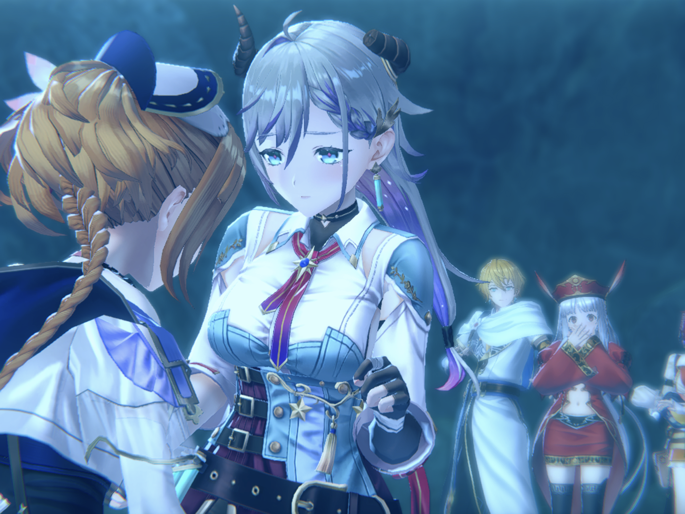 战斗需要编队至多五人,会显示队伍战力,每次战斗都会有推荐战力,初始可携带两个道具,战斗回合积累到一定次数时可不限角色使用,可以全部道具都使用一次。每个角色有两个技能,对hp和break条有不同程度的削减,一般第一个技能削减较少但会加buff/debuff,第二个技能削减较多可以无脑施放,没有mp限制,魔物break后战斗轮次会大幅后移,burst值积累到一定程度可以使用大招,每个角色会自带属性,我知道的有火冰还有斩属性打属性(怪),好像还分了物攻魔攻但我没看懂。战斗时可以开自动模式,育成任务完成后就可以消耗体力略过战斗直接获得相应素材。