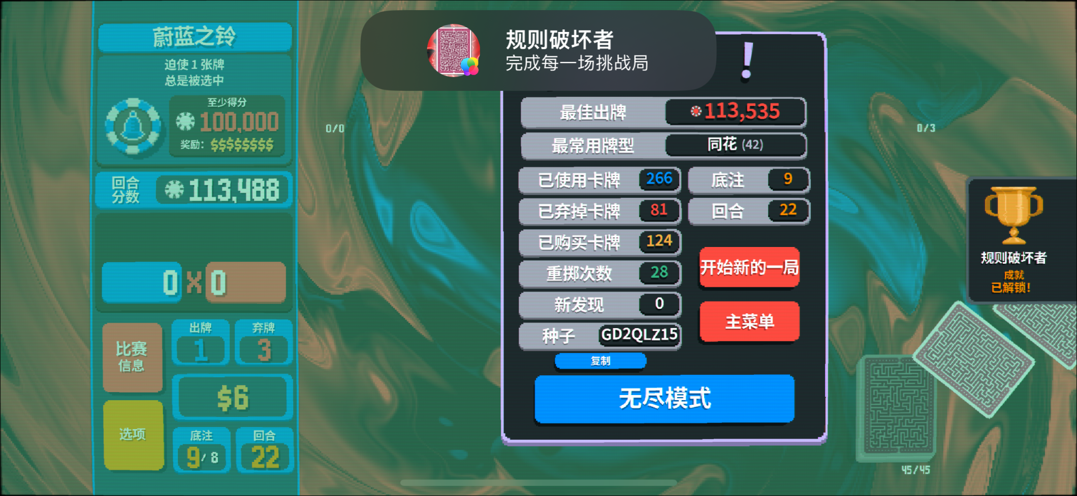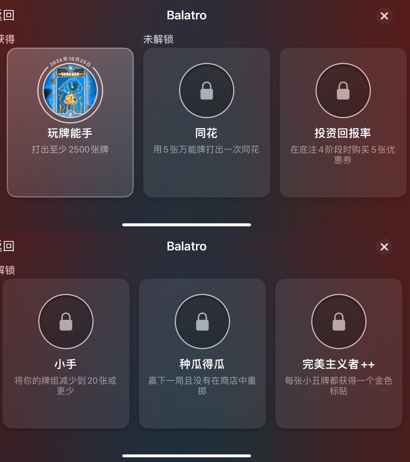 随着最后一个无小丑通关,所有的小丑牌挑战都完成了,现在就只需要完成最后5个成就。