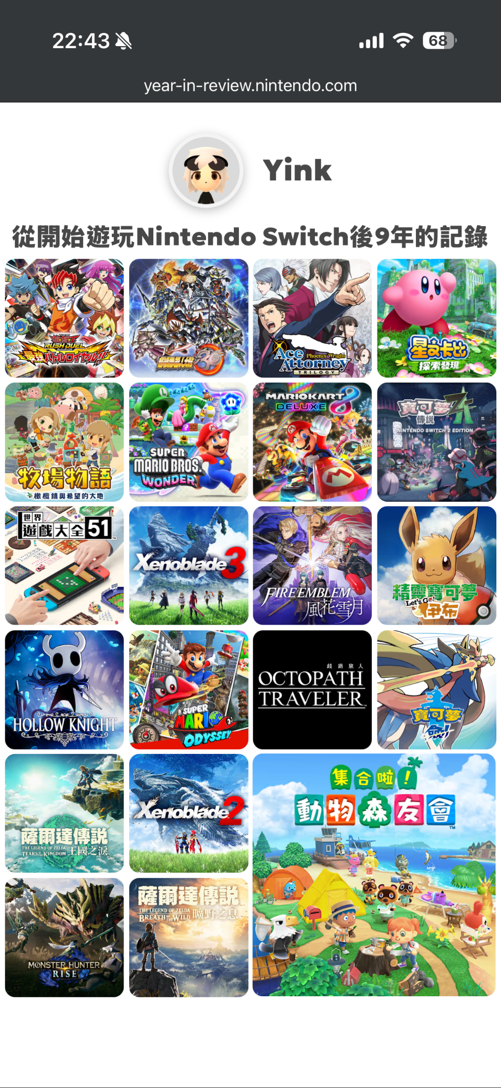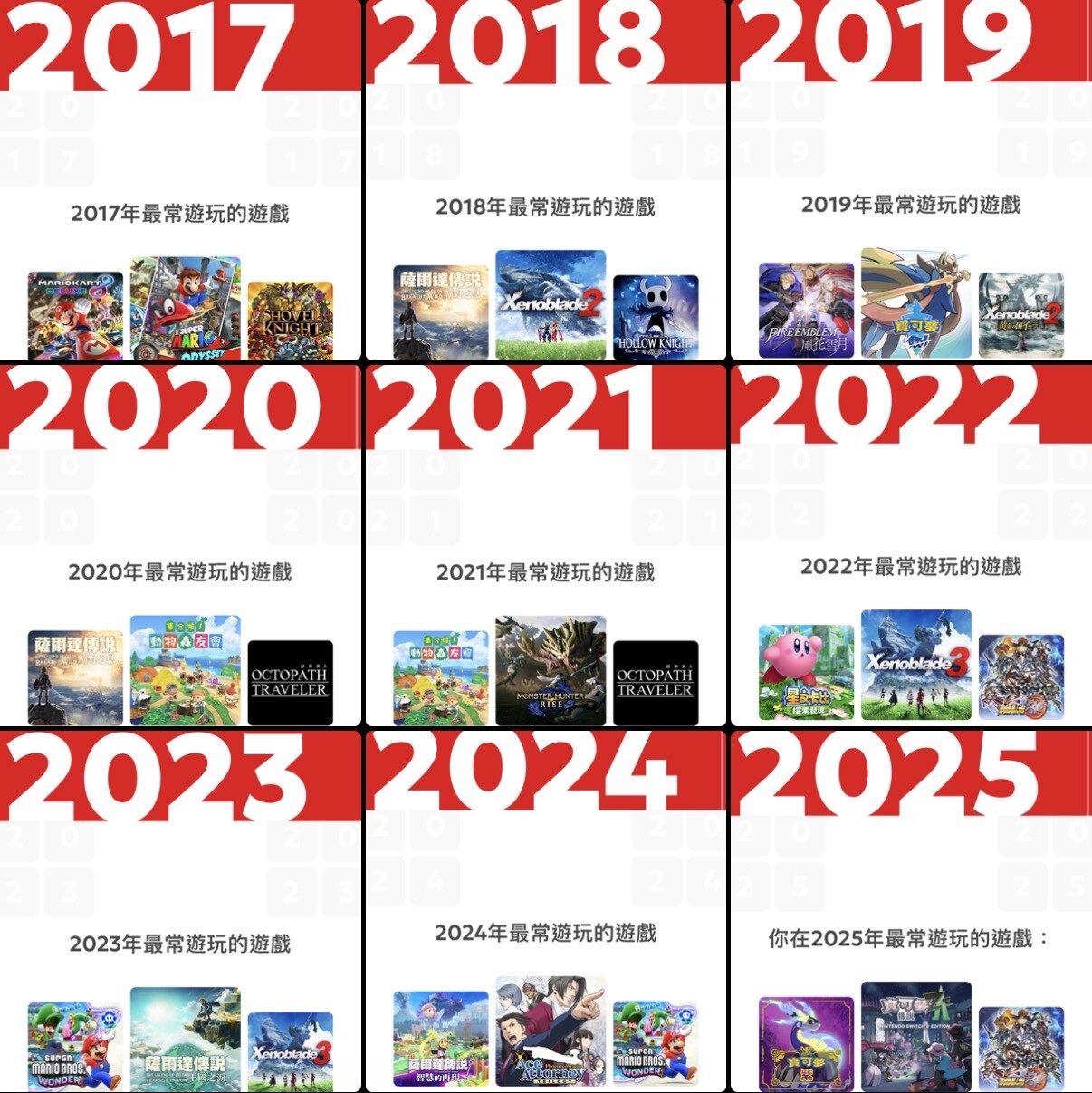 原来今年的Nintendo年度总结竟然还附带了个历史总结。17年-21年每年都有几百小时的游戏时间,但从22年开始骤降到每年只几十小时的样子(除去23年王国之泪这个例外还是玩了挺长时间的)