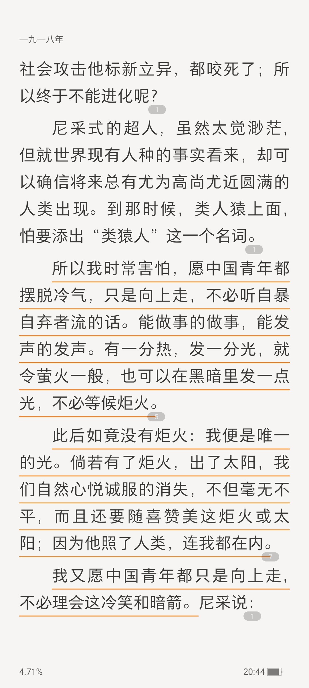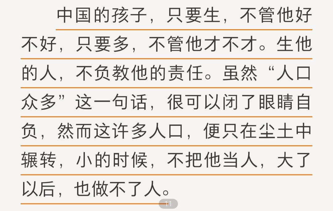 结合前面1919年的《我们现在怎样做父亲》来看,1925年的鲁迅对于曾经自己与天演论相合教育理解有所迷茫,但是那篇里面也倡导了优生优育,举了易卜生戏剧《群鬼》的例子,欧士华后悔出生且希望母亲杀了他。不知道迅哥有没有对反生育这件事有所感悟呢…不过看来没有,迅哥儿应该是主张传承的