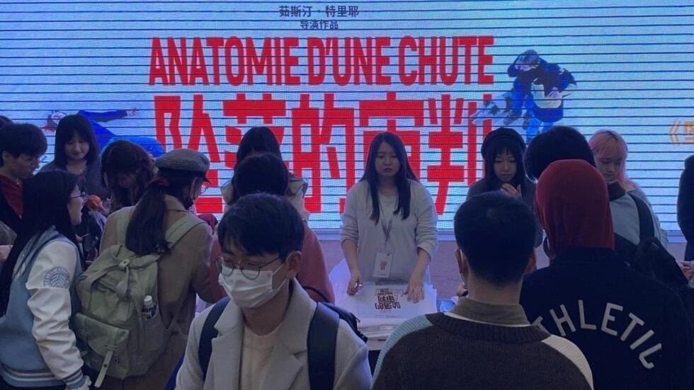《坠落的审判》放映即将开始。在入口处,人们先恐后地领取门票和电影海报。巨大会议室的底层和阳台上挤满了人。观众抢购了 2000 个座位。“所有座位在几个小时内就被抢购一空。”接待处的一位工作人员透露道。