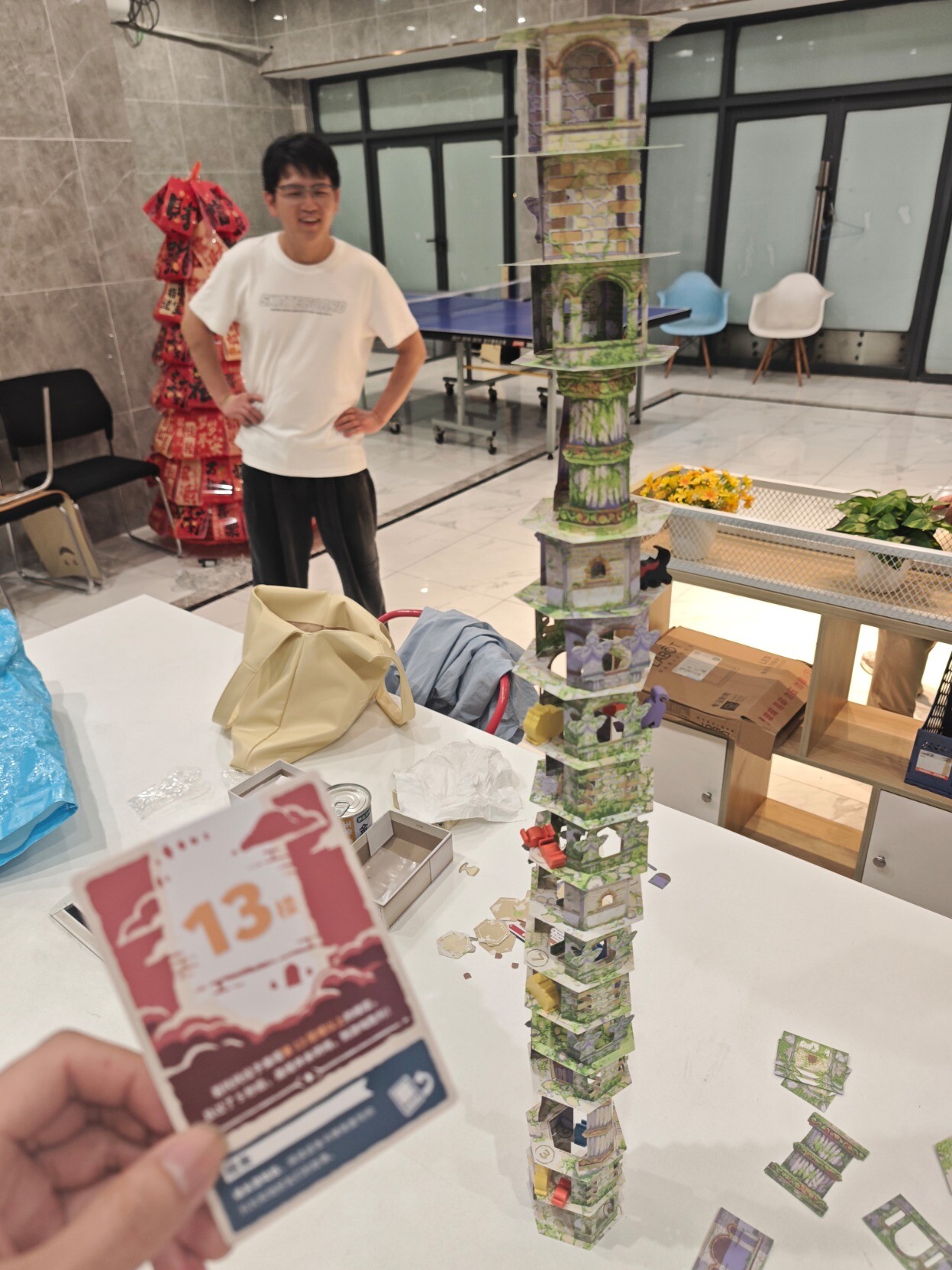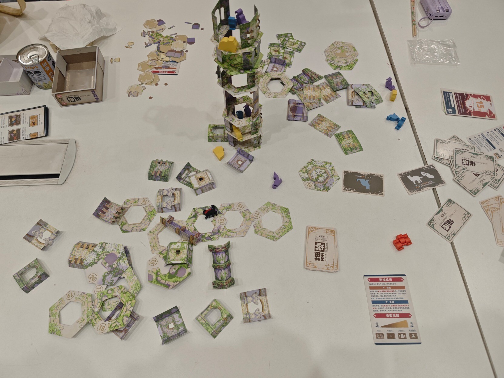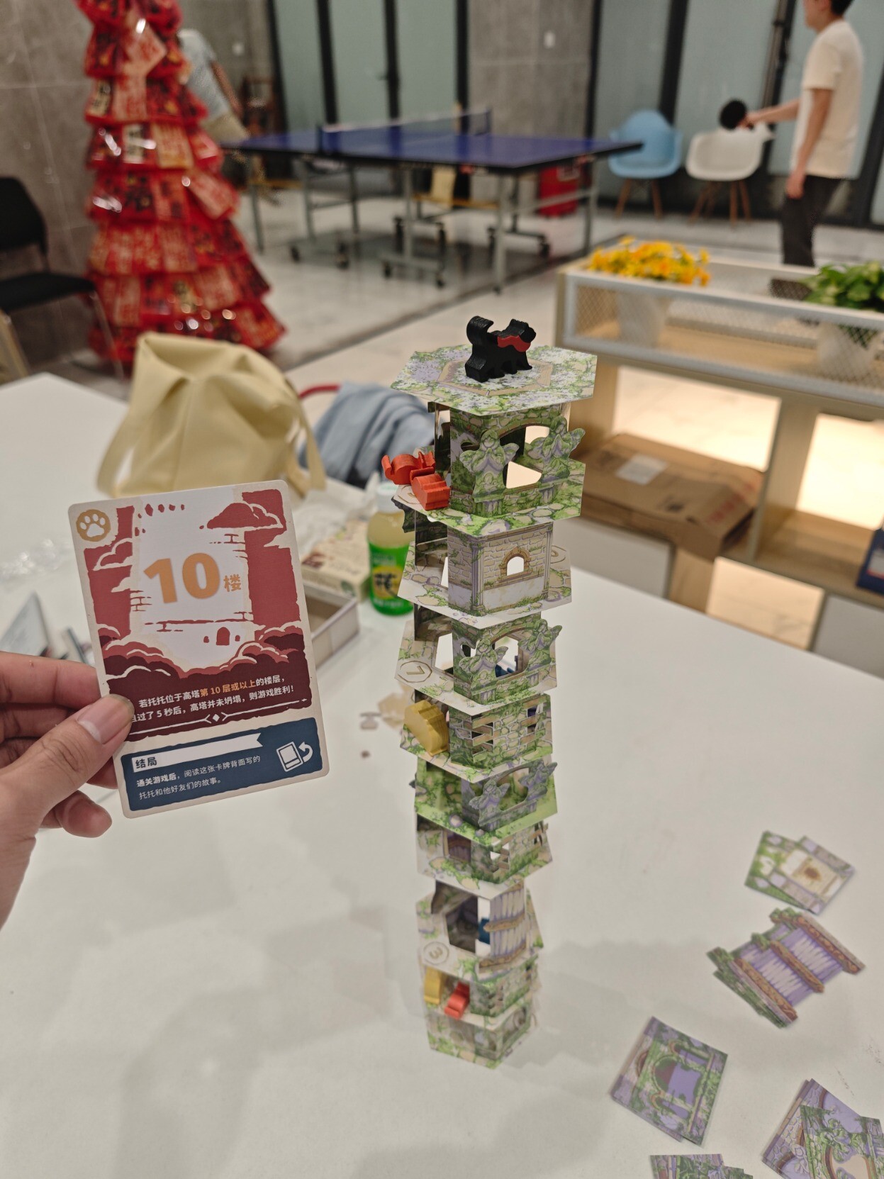 昨天跟桌游搭子挑战之前一败涂地的『猫塔』,需要把塔搭起来不倒塌同时完成各种任务,因为是在公共活动室环境算是比较恶劣,有人在旁边打乒乓(球会飞过来),有人走来走去(会撞到桌子),但我们居然出乎预料的搭到20层,同时离结局3就差那么一点点(只差行动把猫放上去就行),可惜一阵风吹过来吹倒了(完全没想到会是这样倒的),但也很满足了,整个过程无数次的把心提到嗓子眼,无数次的因为成功放置而摆出胜利的姿势,看它渐渐变高,真的挺有成就感的,真不愧是BGM玩家投出的最佳游戏。这也是我第一次玩的需要踮脚尖的桌游,好高好高,老高了……后面几乎是每放一层就拍一次照,生怕失手错过了拍照时机。