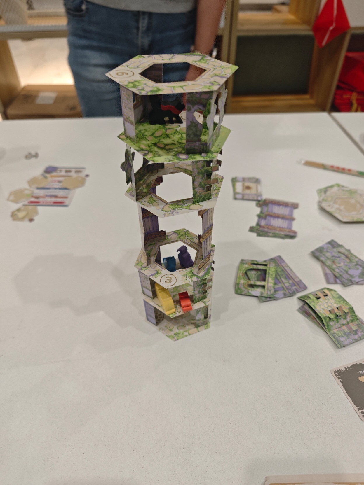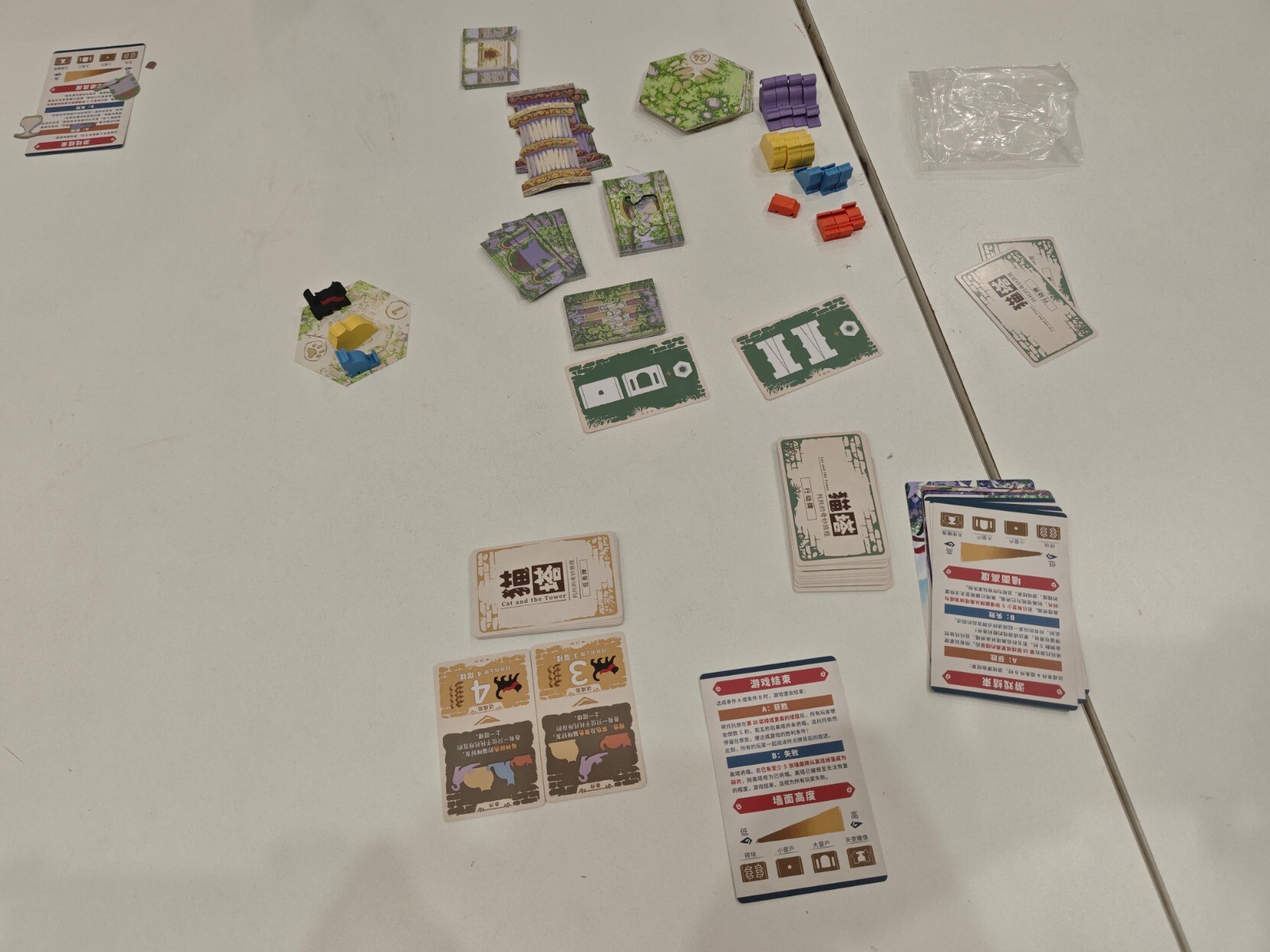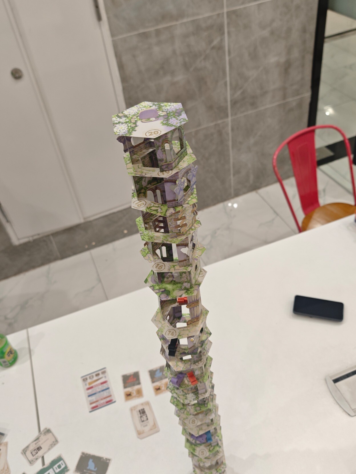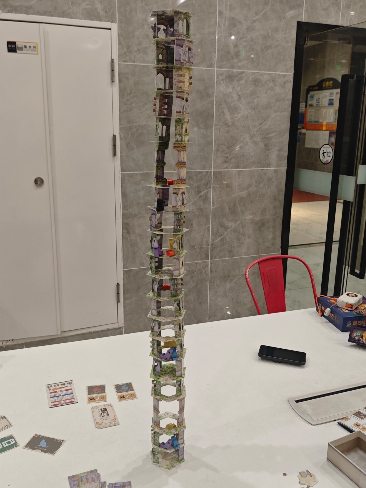 昨天跟桌游搭子挑战之前一败涂地的『猫塔』,需要把塔搭起来不倒塌同时完成各种任务,因为是在公共活动室环境算是比较恶劣,有人在旁边打乒乓(球会飞过来),有人走来走去(会撞到桌子),但我们居然出乎预料的搭到20层,同时离结局3就差那么一点点(只差行动把猫放上去就行),可惜一阵风吹过来吹倒了(完全没想到会是这样倒的),但也很满足了,整个过程无数次的把心提到嗓子眼,无数次的因为成功放置而摆出胜利的姿势,看它渐渐变高,真的挺有成就感的,真不愧是BGM玩家投出的最佳游戏。这也是我第一次玩的需要踮脚尖的桌游,好高好高,老高了……后面几乎是每放一层就拍一次照,生怕失手错过了拍照时机。