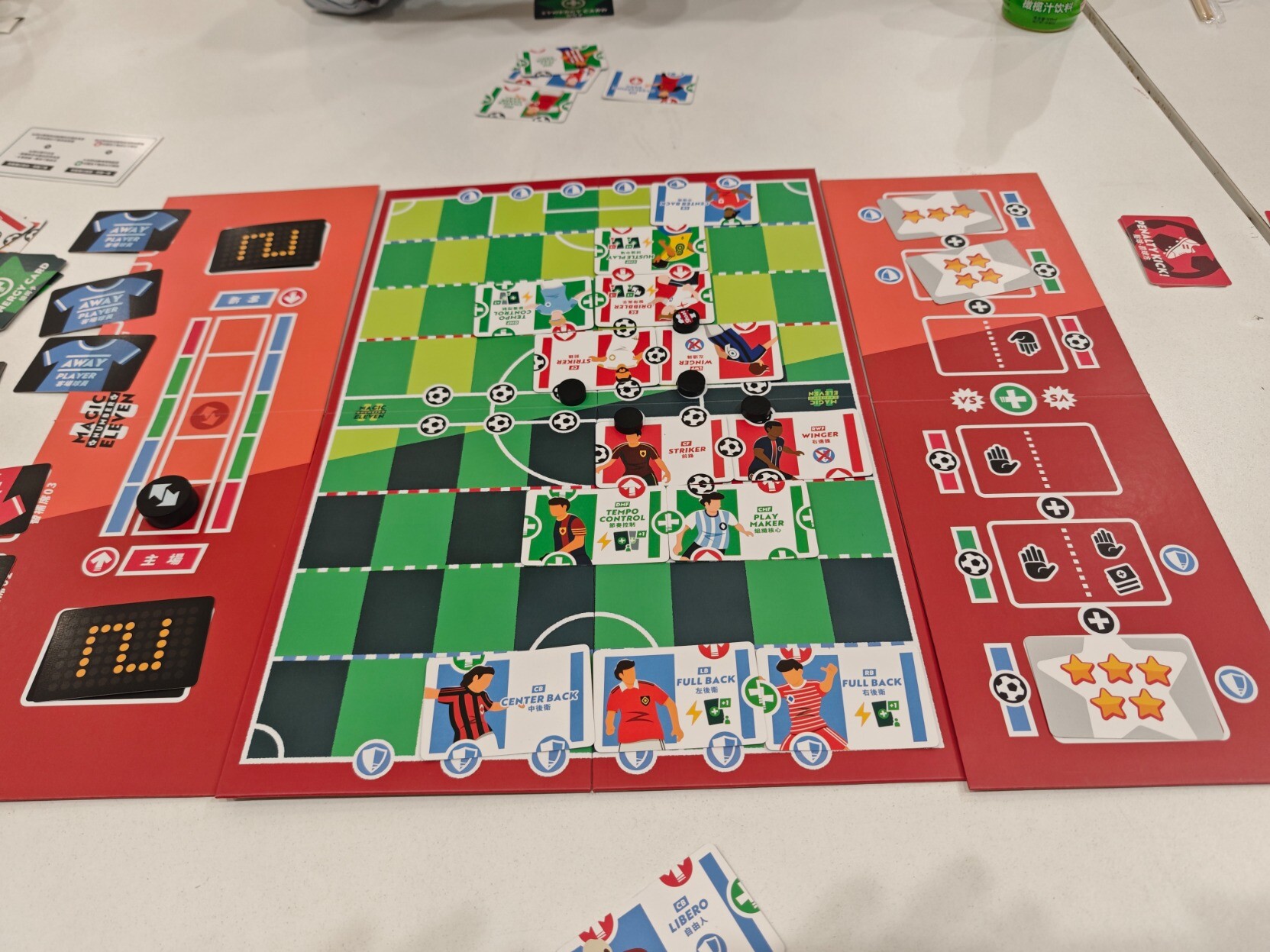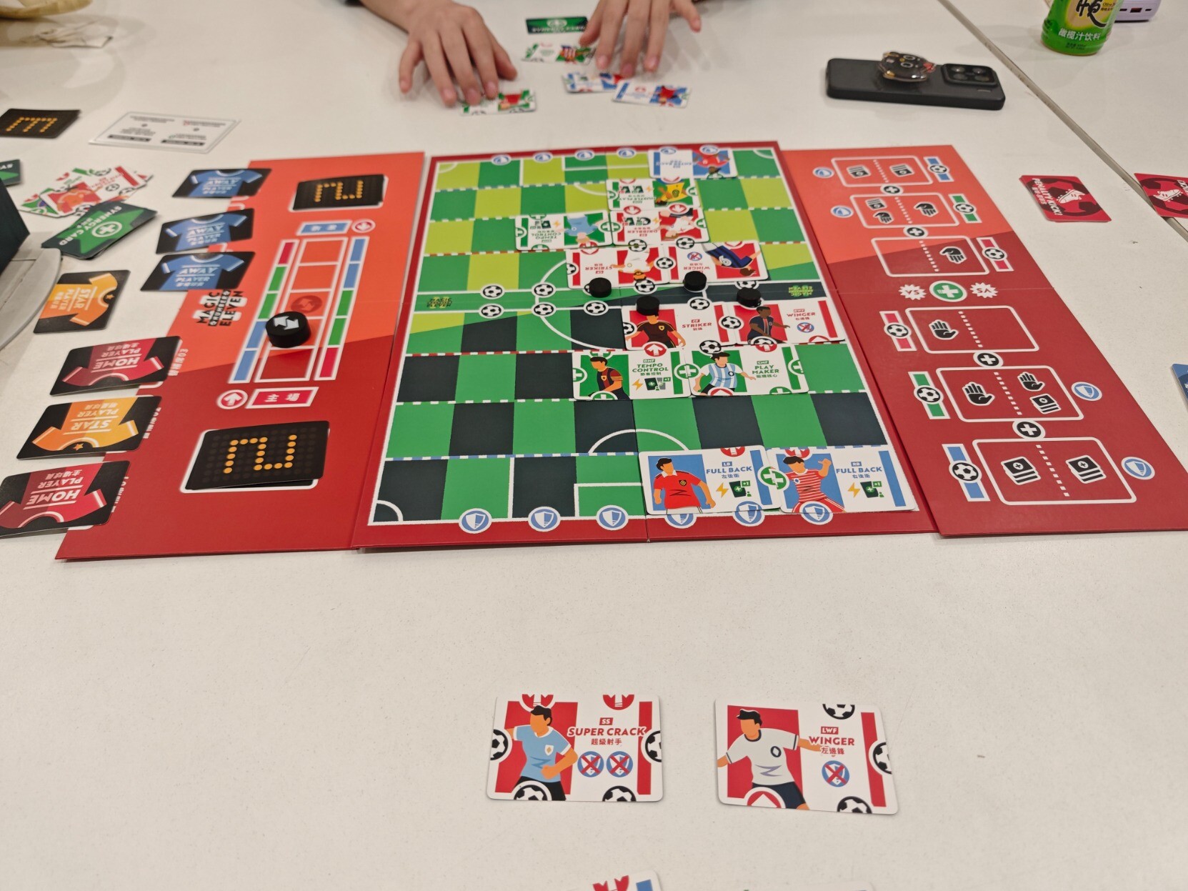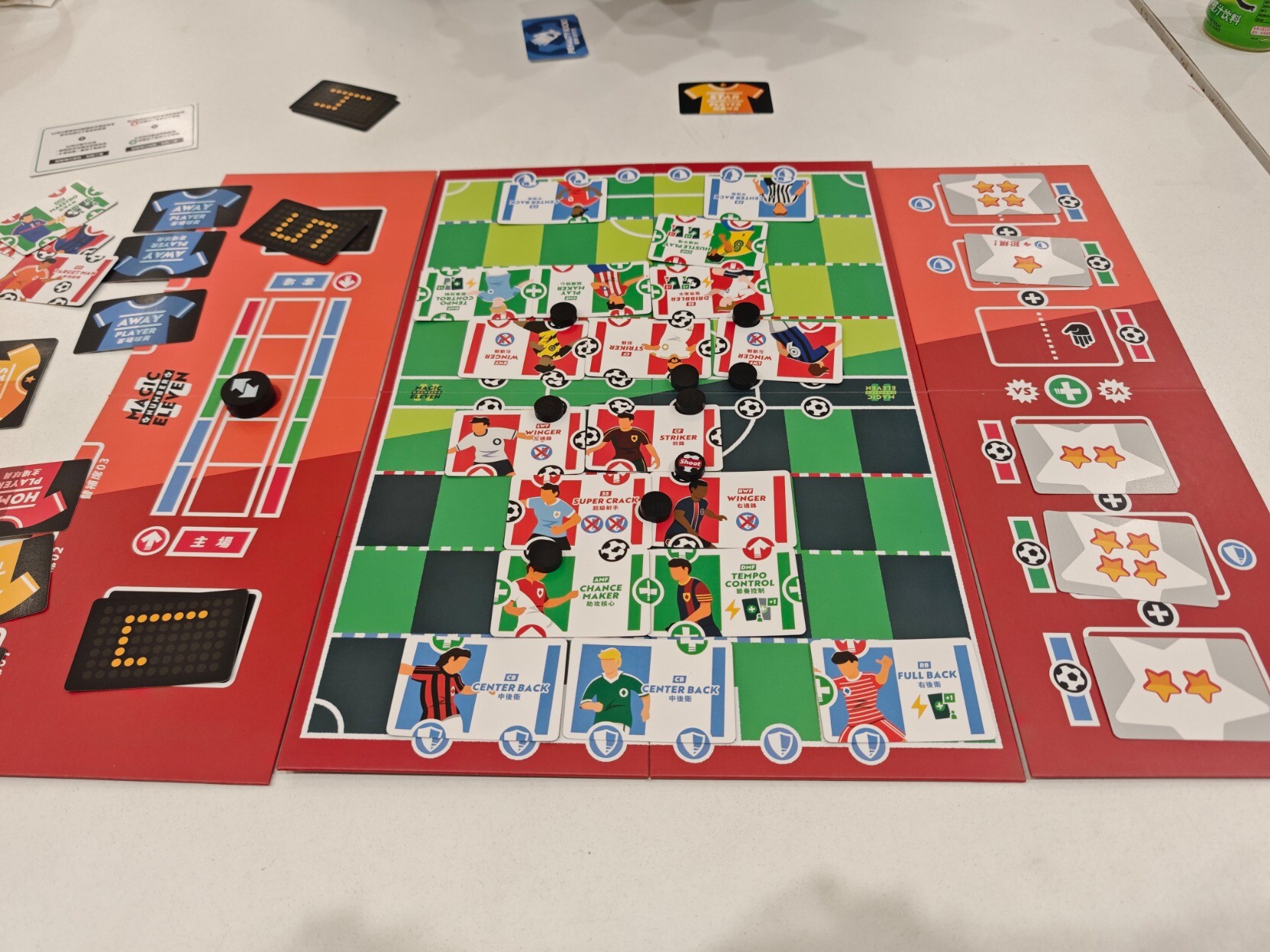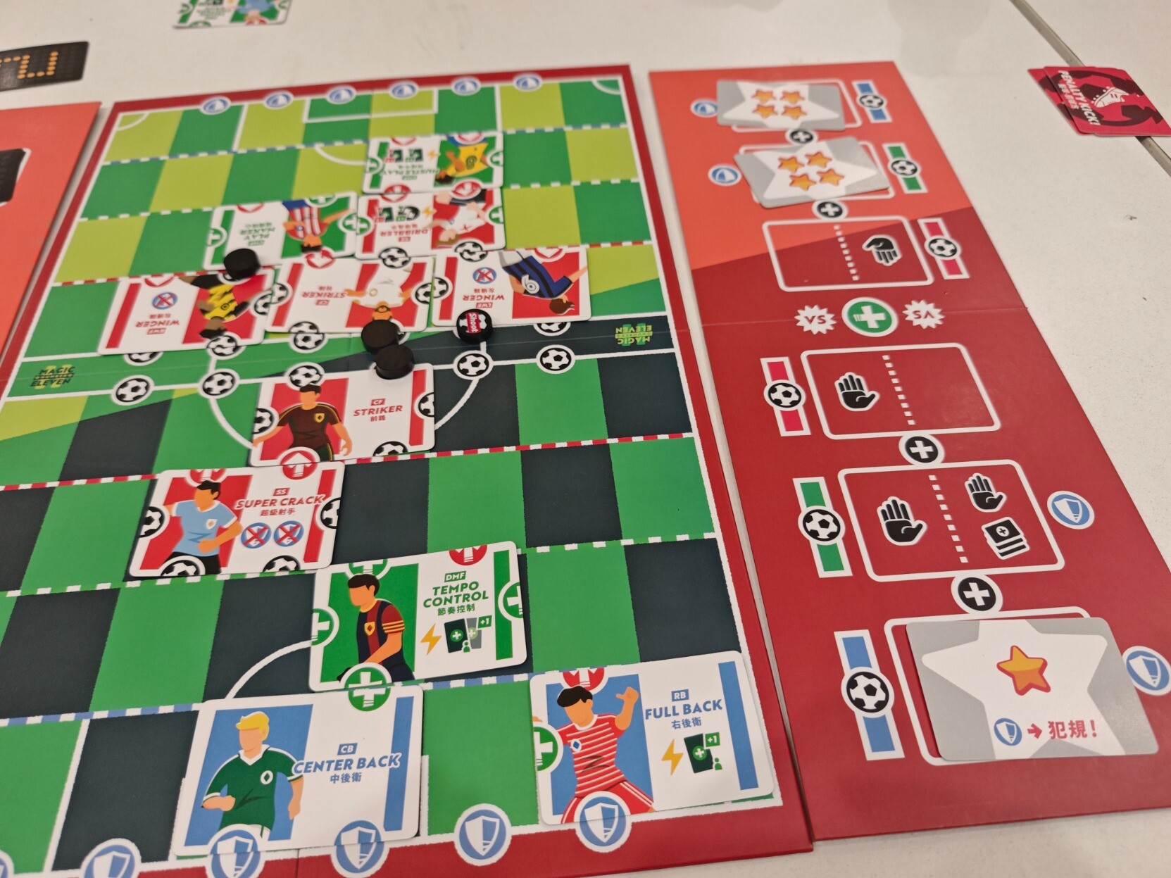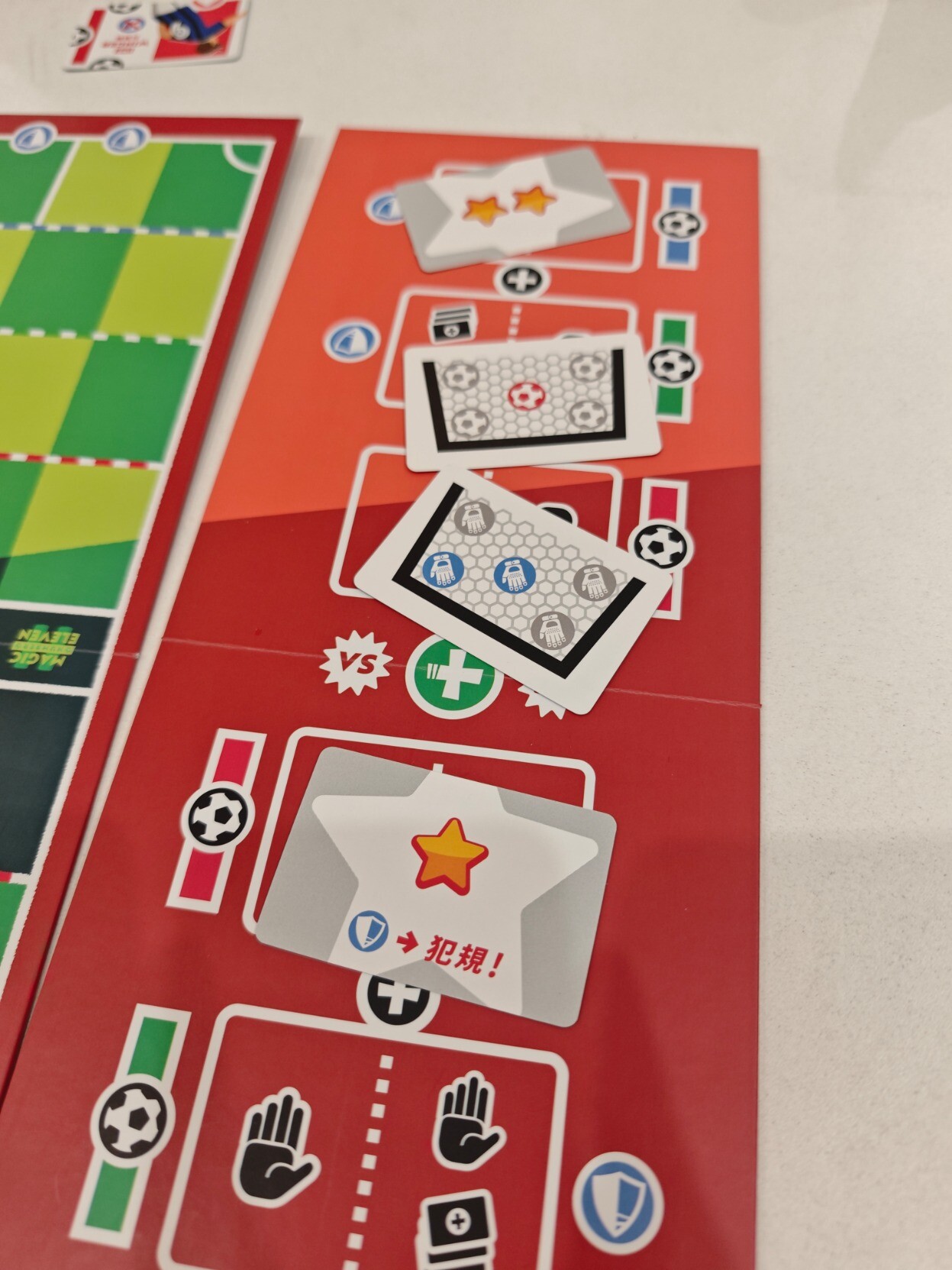 #周五桌游夜 不愧是著名的双人游戏,『梦幻十一人』果然名不虚传,很有意思。单纯看规则真的好多好长,但是实际上手很快,但策略性还是有的,应该算中策?明明事先选人的时候已经想好了摆法,结果实际上场的时候经常出现“诶~我刚刚是想的怎么摆的,怎么现在这么多图案拼不出来”。然后射门时的点数比拼环节也是很好玩(虽然我对于控球的绿色区域太小不是很满意),最刺激的还算是世界波(无需判定防守方,直接判定成功射门)但是犯规(唯一能防住世界波的协同牌,抽到或者主动打出)时候的点球大战,设计得太好了。