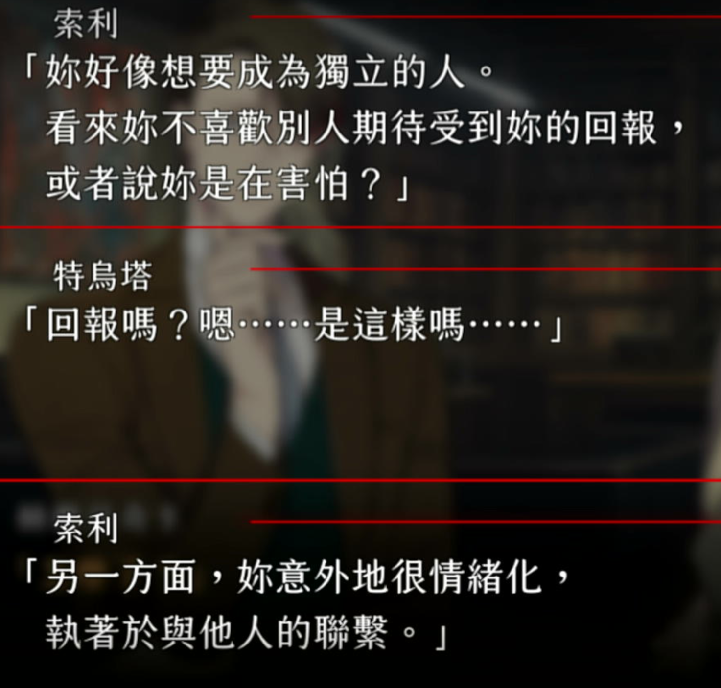 其实我感觉这个游戏还是应该做一下攻略顺序的因为这条线触碰到的世界观的黑暗面和moz还有克罗完全不一样,如果顺着打下来好像就会有深入浅导致后面的更加难看(本来就难看),但是反过来其实就是个由浅入深感觉好多了。