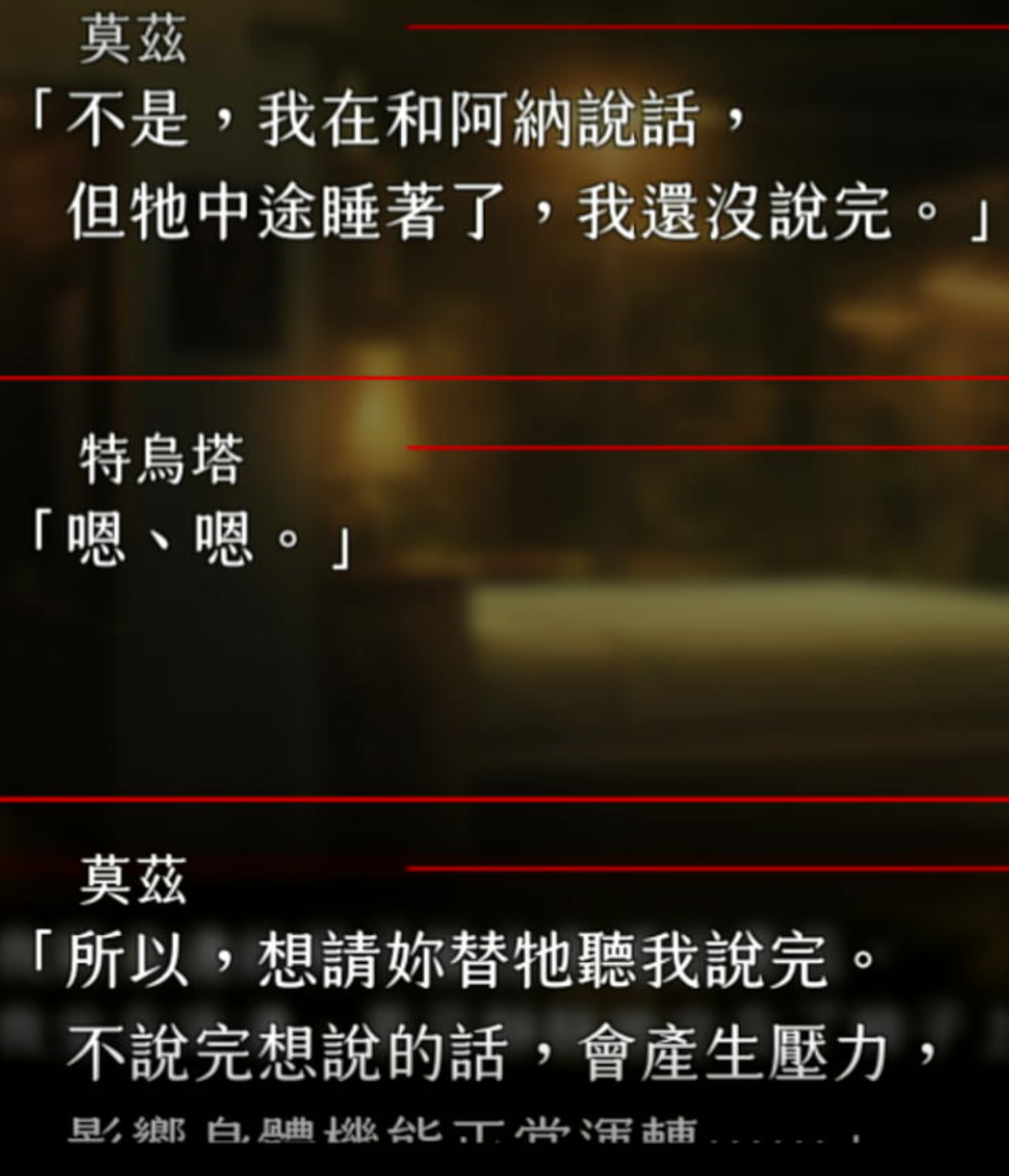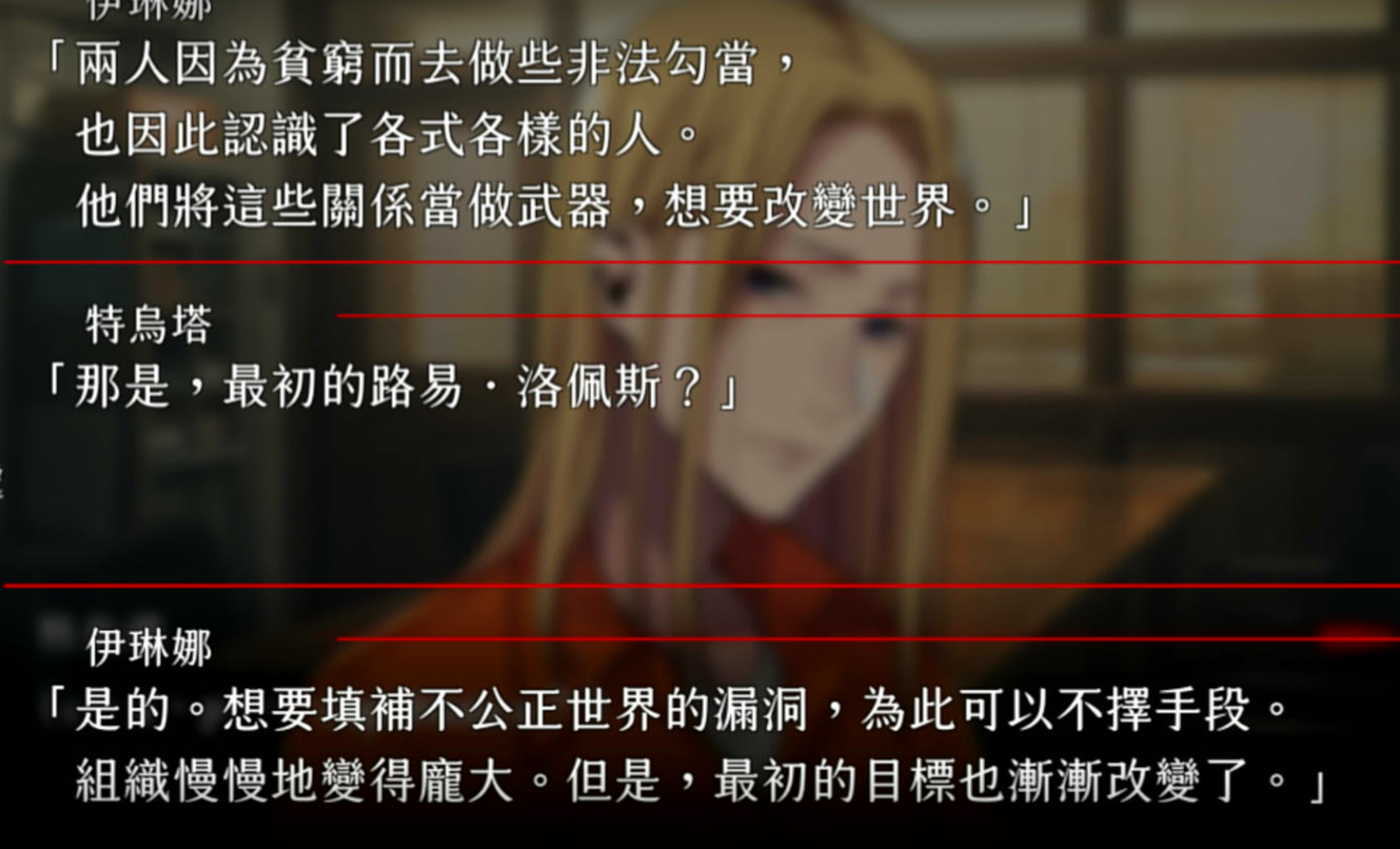 其实我感觉这个游戏还是应该做一下攻略顺序的因为这条线触碰到的世界观的黑暗面和moz还有克罗完全不一样,如果顺着打下来好像就会有深入浅导致后面的更加难看(本来就难看),但是反过来其实就是个由浅入深感觉好多了。