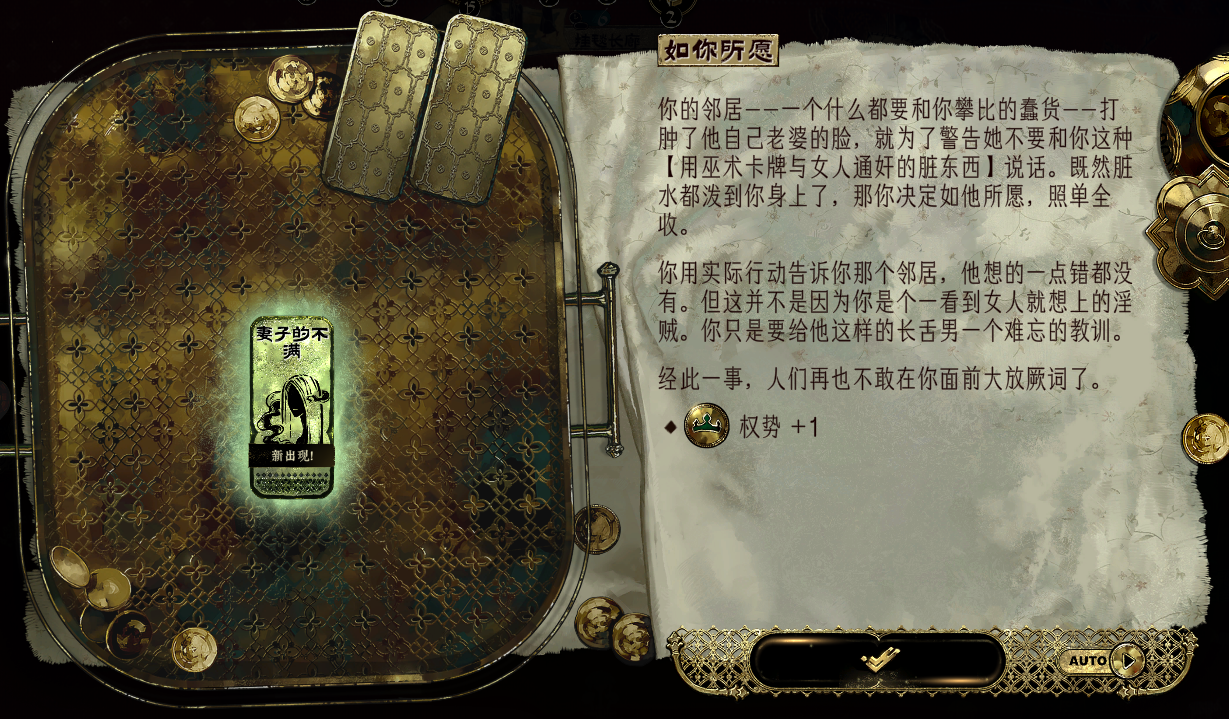 硬着头皮继续打,15金的时候实在是没法去妓院折白银奢靡,还好突然出现一个可以延期苏丹卡的事件,顺理成章拖到了最后关头然后给自己续命七天