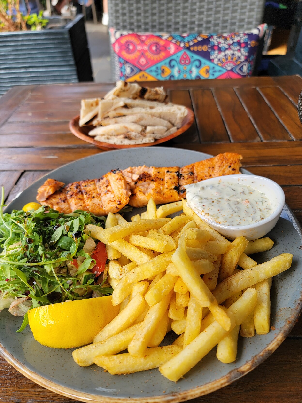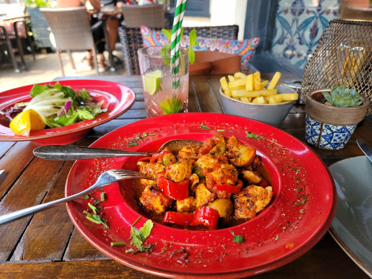 白龙中午在一家土耳其餐厅用餐 :0180: 只点了一份主菜,但这分量还是一如既往地大呢 :0010: 是番茄酱、番茄、彩椒、香料、蘑菇一起炖的鸡♡还有看起来是一大盘,其实吃起来很快的沙拉,搭配薯条 :0180: 之所以没选米饭,是因为他们米饭!!用牛奶熬!!(乳糖不耐受白龙震怒)