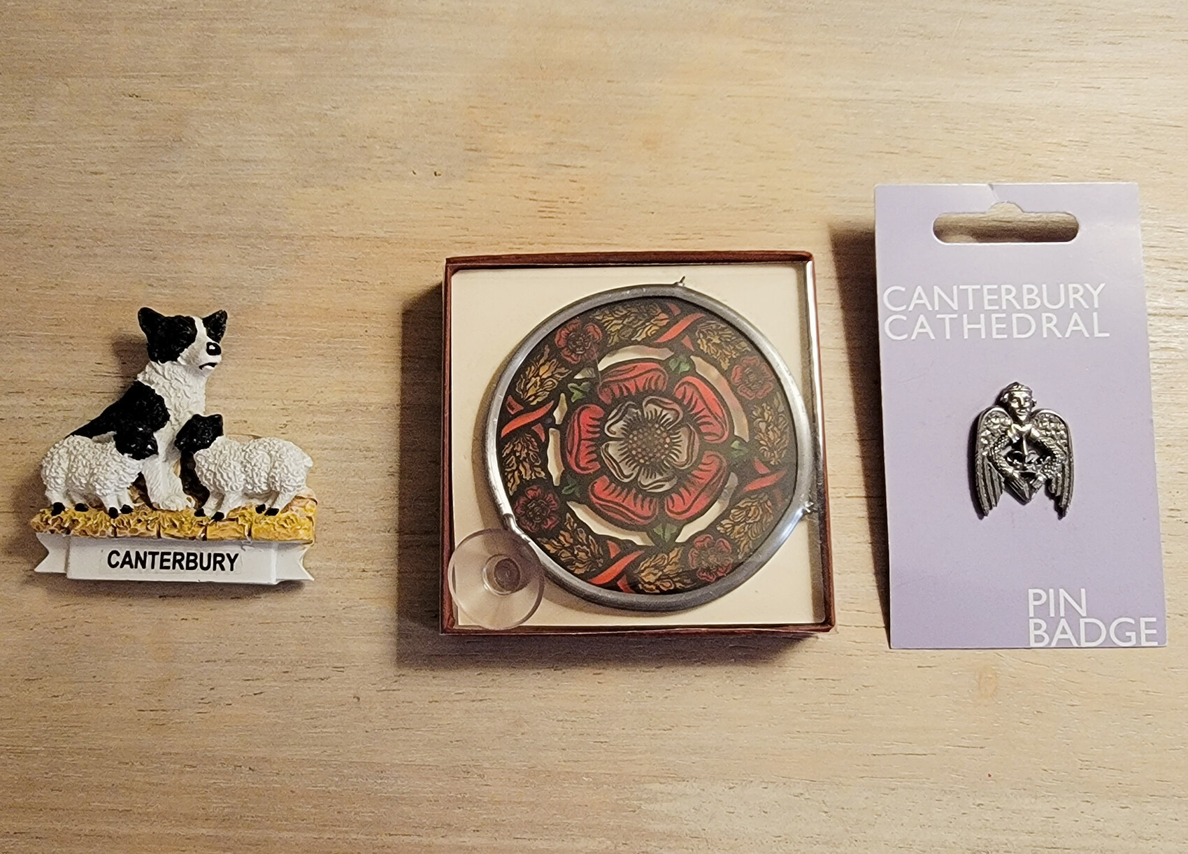 最后发一下白龙在坎特伯雷买的游客纪念品罢 :0180: 小边和黑面羊的吸铁石很可爱,圆圆的那个是玻璃花窗挂件(图案事印的),还有徽章控白龙买的银色小徽章 :0180:
