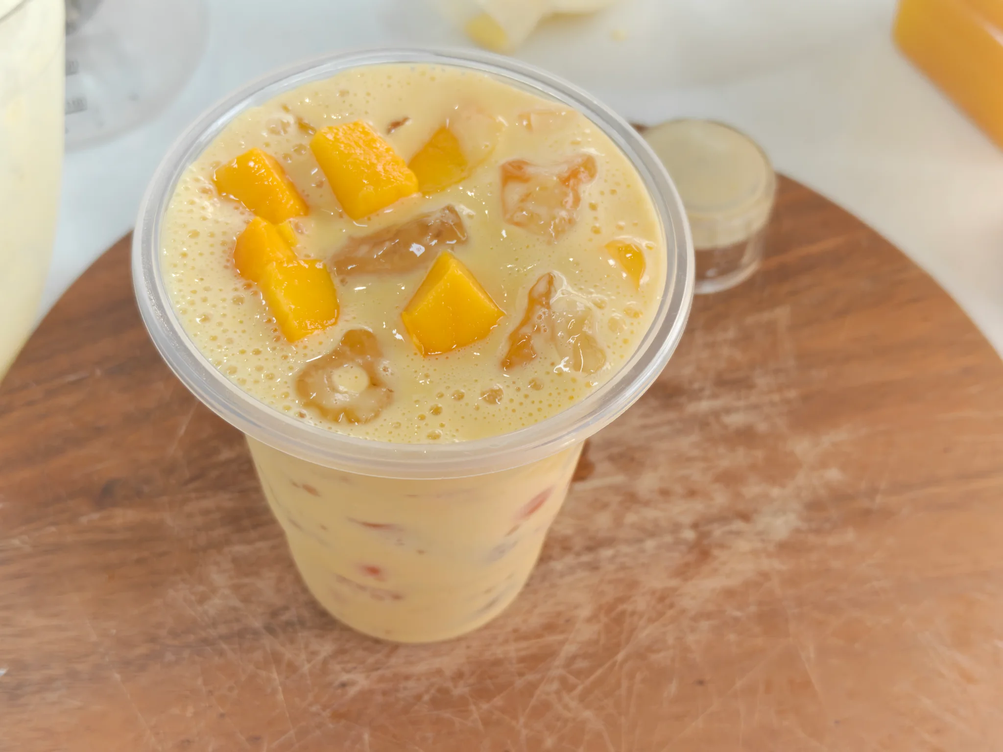 请你们喝杨枝甘露杨枝甘露:西柚40g 西米20g 芒果浆 54g 莓果冻20g 椰果 18g 椰浆36g 牛奶36g 用冰块把水补满到360ml 雪克杯摇一摇就能和拉。如果是商用的话直接用芒果浆 家用直接用台芒打碎就好了香味更加自然好喝。这些全部材料都可以买成品然后直接做